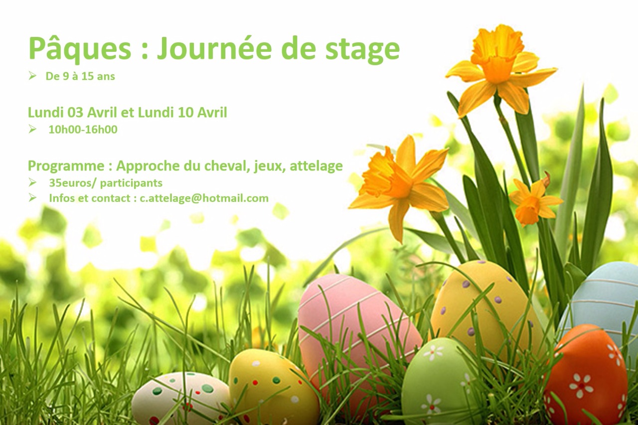 L'hiver étant bientôt passé, voici le retour des stages d'une journée durant lesquelles les enfants découvriront le cheval. Equitation le matin, attelage l'après-midi. Et sur le temps de midi une chasse aux oeufs est prévue!